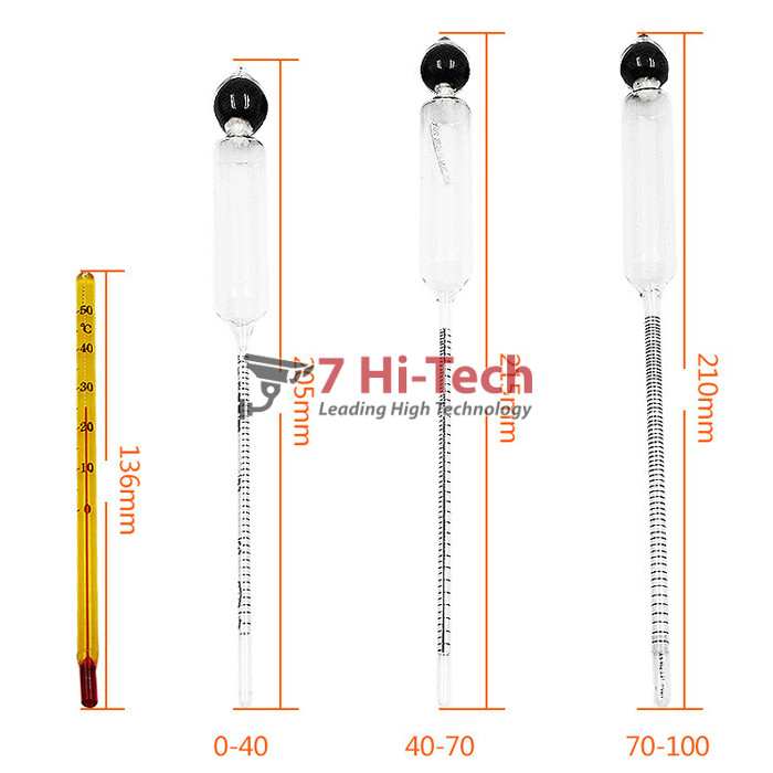 - Sản phẩm bao gồm: 01 nhiệt kế đo nhiệt độrượu, 03 cồn kế (0-40, 40-70, 70-100)Cồn kế là dụng cụ để đonồng độ cồn (sử dụng cho Rượugạo, Rượutrắng)